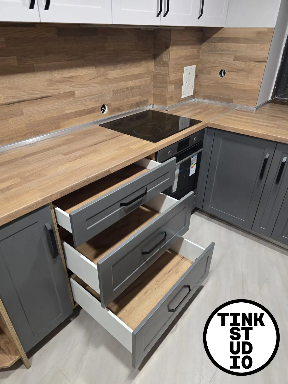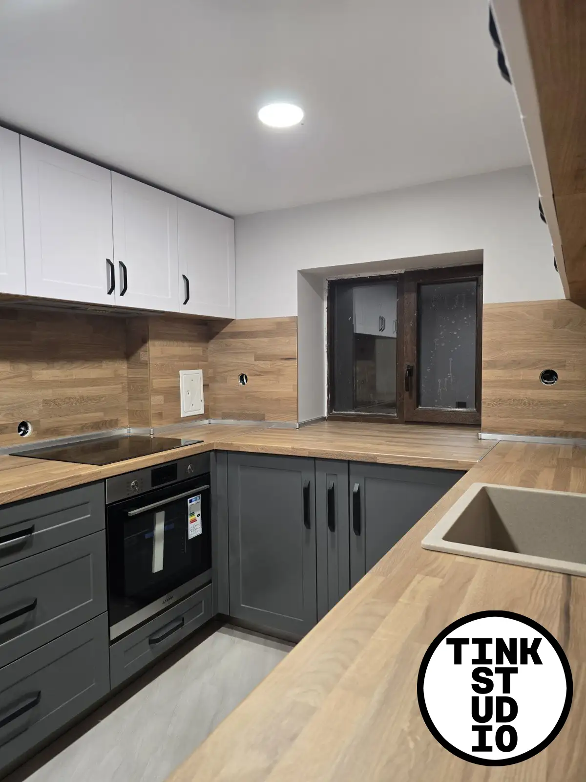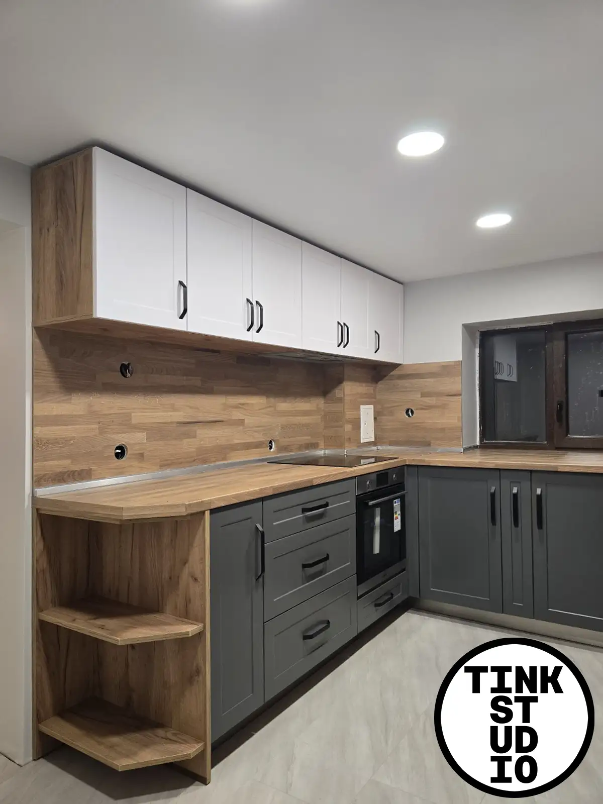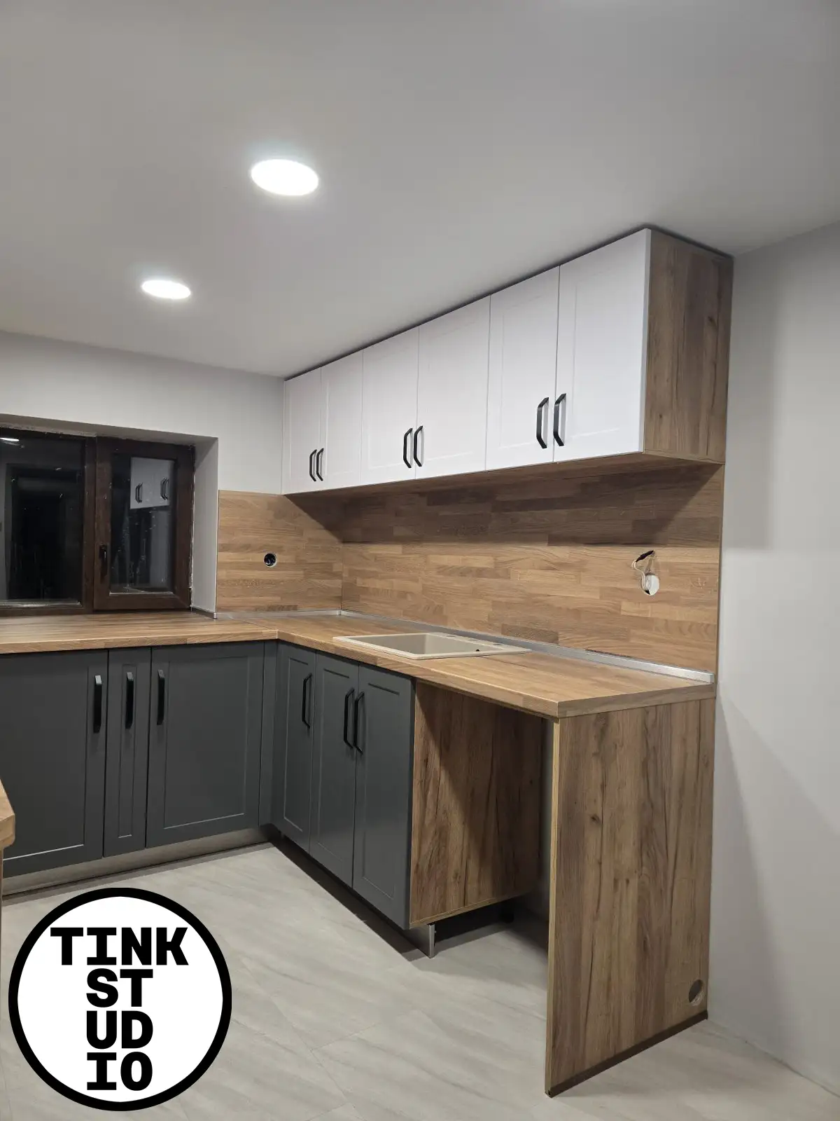 Тази кухня е създадена с акцент върху естествената естетика и хармонията в пространството. Лицата Nature в двата реда създават плавен и балансиран преход, като долният ред в цвят C1449 носи топлина и дълбочина, а горният ред в C1854 придава светлина и визуална лекота. Корпусът K003 осигурява стабилна основа, а плотът и гърбът K091 допълват визията с изчистен и стилен завършек. Дръжките №13 на 128 мм подчертават естествения характер на кухнята и осигуряват комфорт при ежедневна употреба.